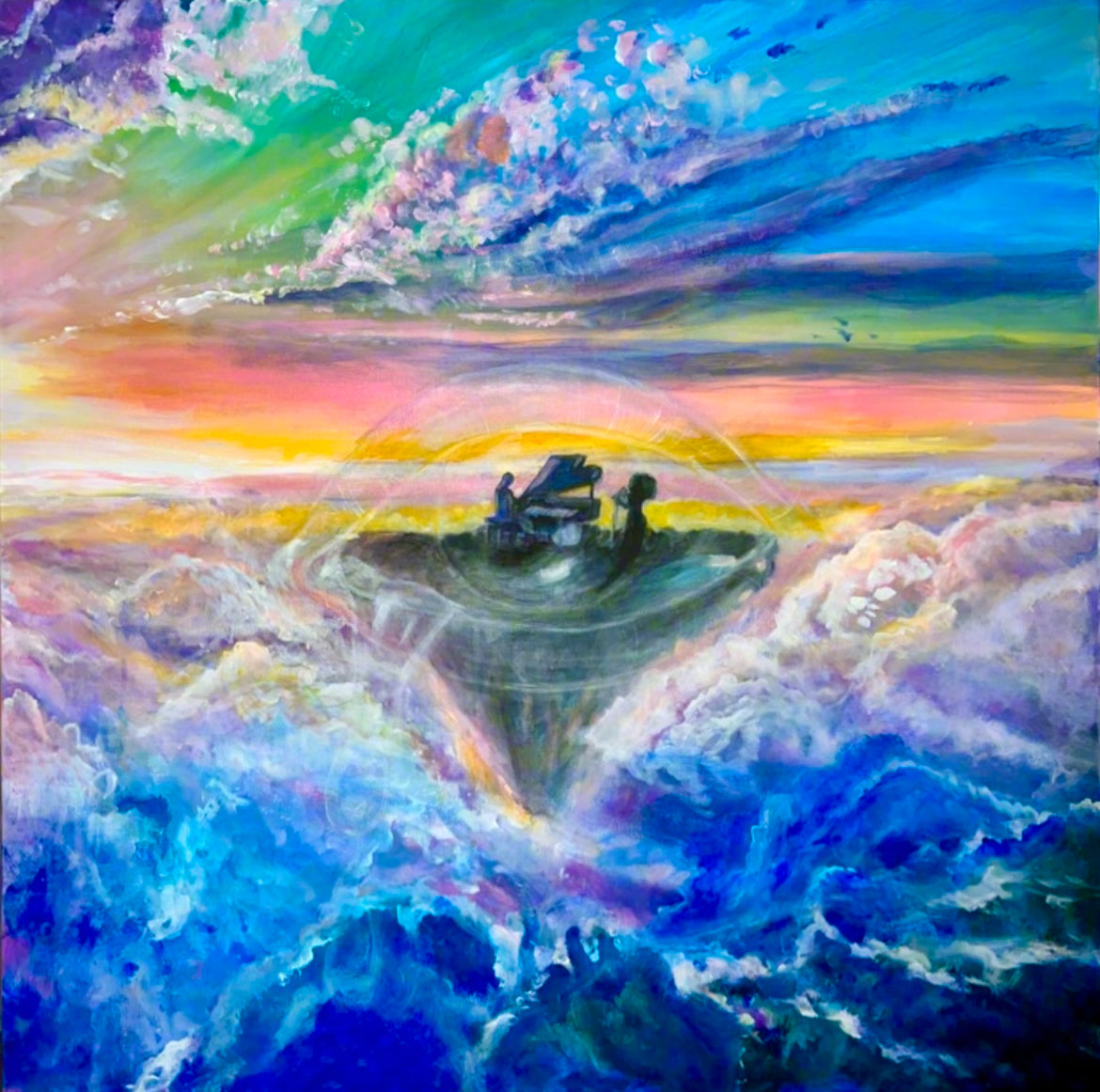 Eyes of the Divine was born from a meditation, when a vision pressed through my third eye: see beauty in all things. From that stillness, a scene unfolded, sunset clouds revealing a man and woman playing music in the sky, their chords echoing the rhythm of life. At the center, a transparent eye emerges, soft yet powerful, a quiet reminder to witness the world with awareness and wonder.